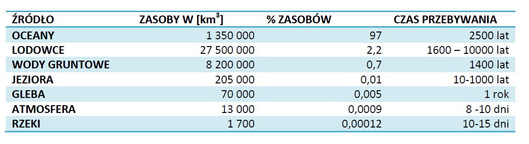 Tabela poniżej przedstawia zdeponowane zasoby wodne w poszczególnych obszarach środowiska.